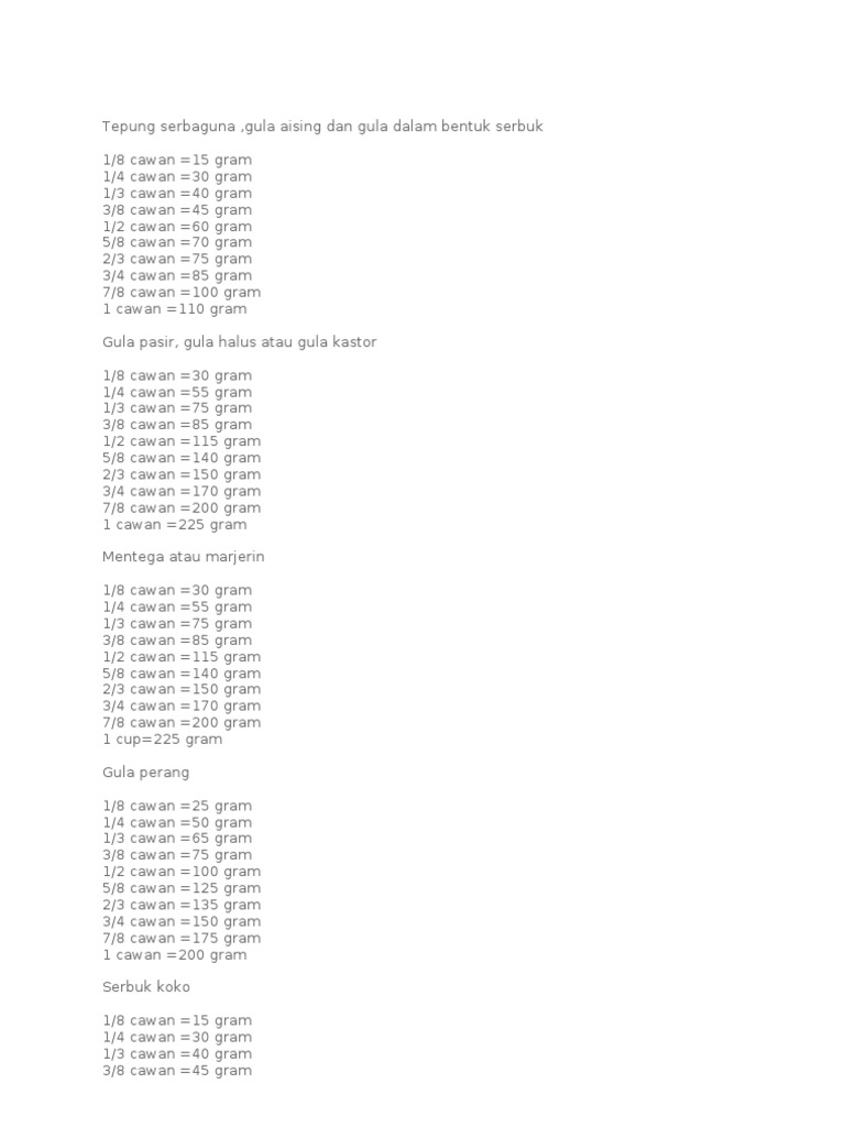 Tukar Sukatan Gram Ke Sukatan Cawan Dalam Resepi Masakan Informasi Santai from 2.bp.blogspot.com Anggaran sukatan cawan dan sudu ke gram dan liter #thankyouforwatching. Kukus selama 5 minit dengan api kuat. · 1 camca besa penuh tepung kastard. 50 ml = 1/4 cawan 125 ml = 1/2 cawan 180 ml = 3/4 cawan 250 ml = 1. Seringkali kita terjumpa singkatan seperti tbsp dan tsp dalam kebanyakan resepi masakan. Sukatan yang dikongsikan kat bawah ni lebih kurang saja tau. Hari ni nak share resepi asas doh biskut yang mudah sukatan cawan. Apakah yang dimaksudkan dengan sukatan sudu tbsp dan tsp ini?